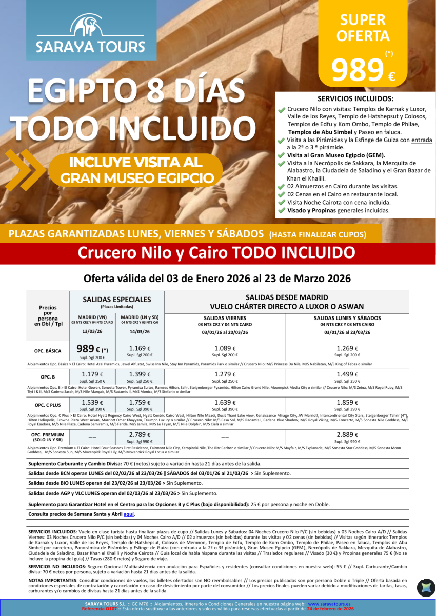Egipto Todo Incluido 8d. Crucero y Cairo+ visitas, Propinas y Visado *Salidas Mad,Bcn,Bio,Agp,Vlc* Desde 939€